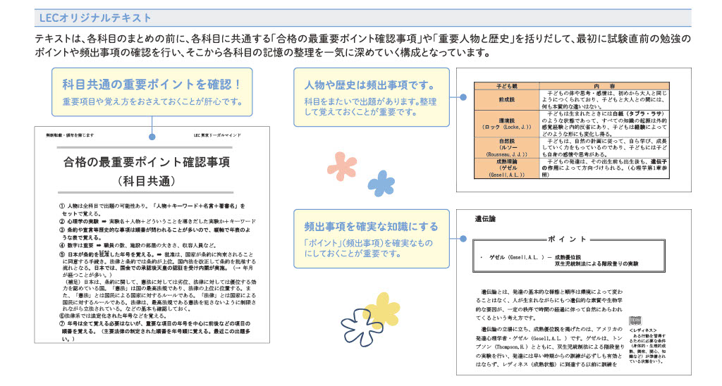 - テキストは、各科目のまとめの前に、各科目に共通する「合格の最重要ポイント確認事項」や「重要人物と歴史」を括りだして、最初に試験直前の勉強のポイントや頻出事項の確認を行いそこから各科目の記憶の整理を一気に深めていく構成となっています。