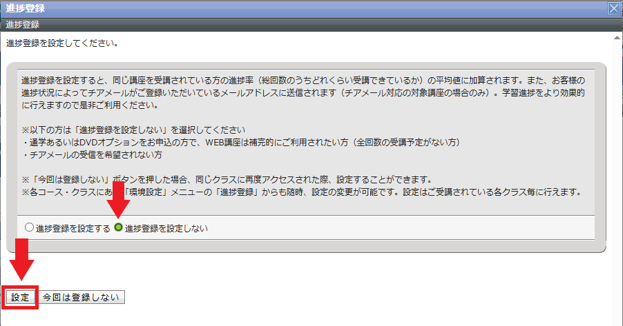「進捗登録を設定しない」にチェックを入れ、設定するをクリックしてください。