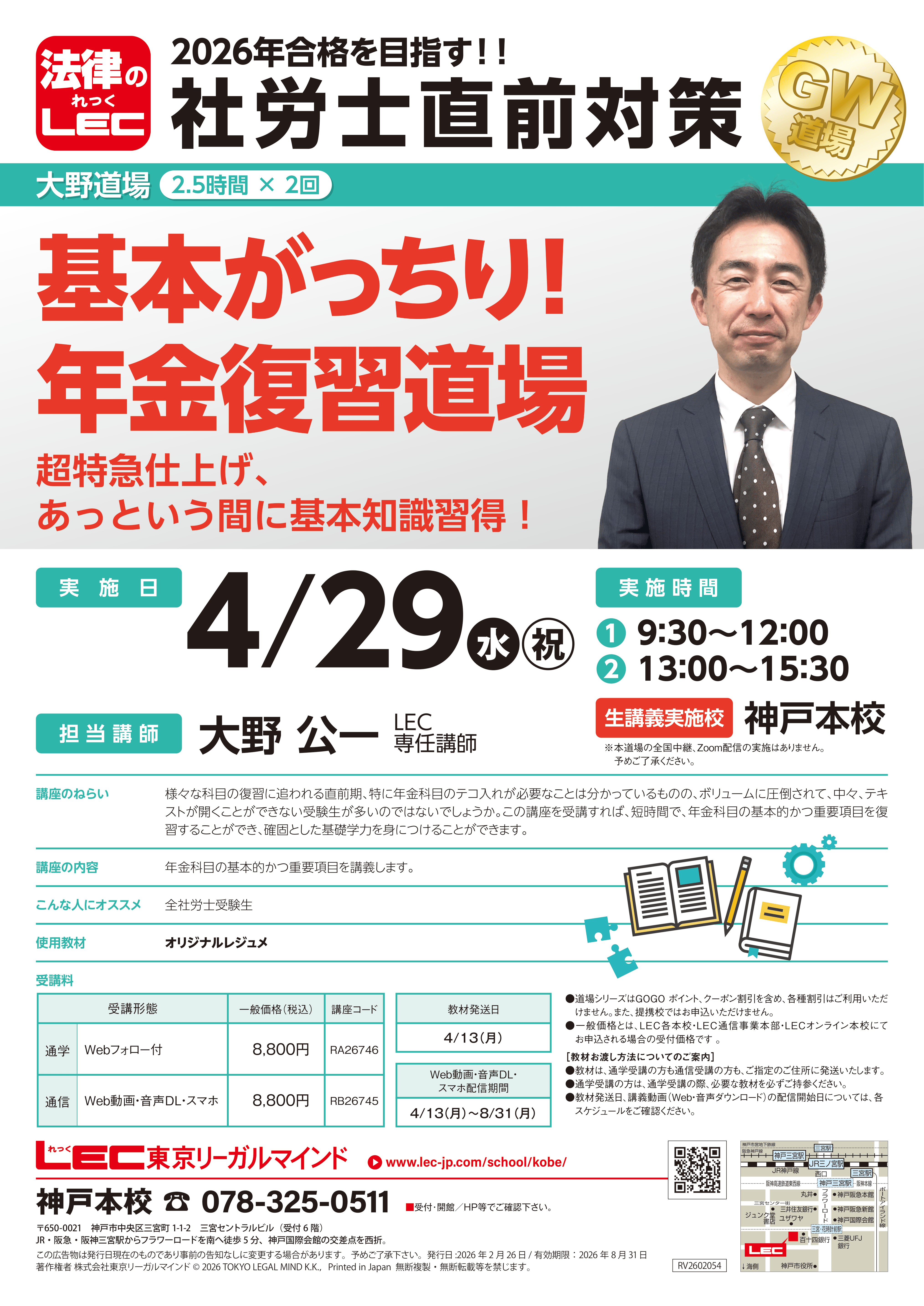 神戸本校 2026.03.03 ■□直前対策道場のご案内□■ 担当の大野 公一LEC専任講師によるガイダンスは↓↓こちら↓↓から! ●その他の直前対策道場はこちら ●直前対策講座はこちら 労務・キャリア系 社会保険労務士 カテゴリー一覧へ LECトップページへ 受講相談予約 資格説明会ガイダンス Zoomガイダンス予約 資料請求 メール問合せ 見積り依頼 公務員合格実績 オリジナルブログ 人材募集 自習室のご案内 教室スケジュール Myページ 重要なお知らせ おすすめトピックス 新着情報 資格について 開講案内 キャンペーン イベント情報 その他