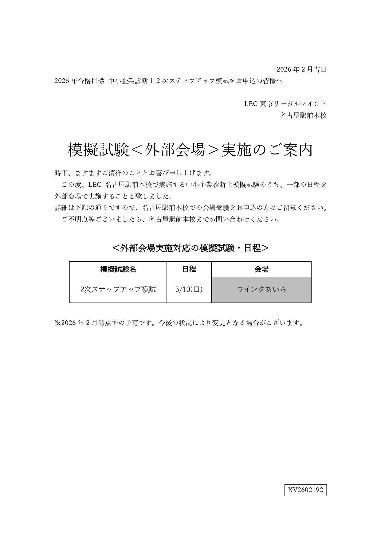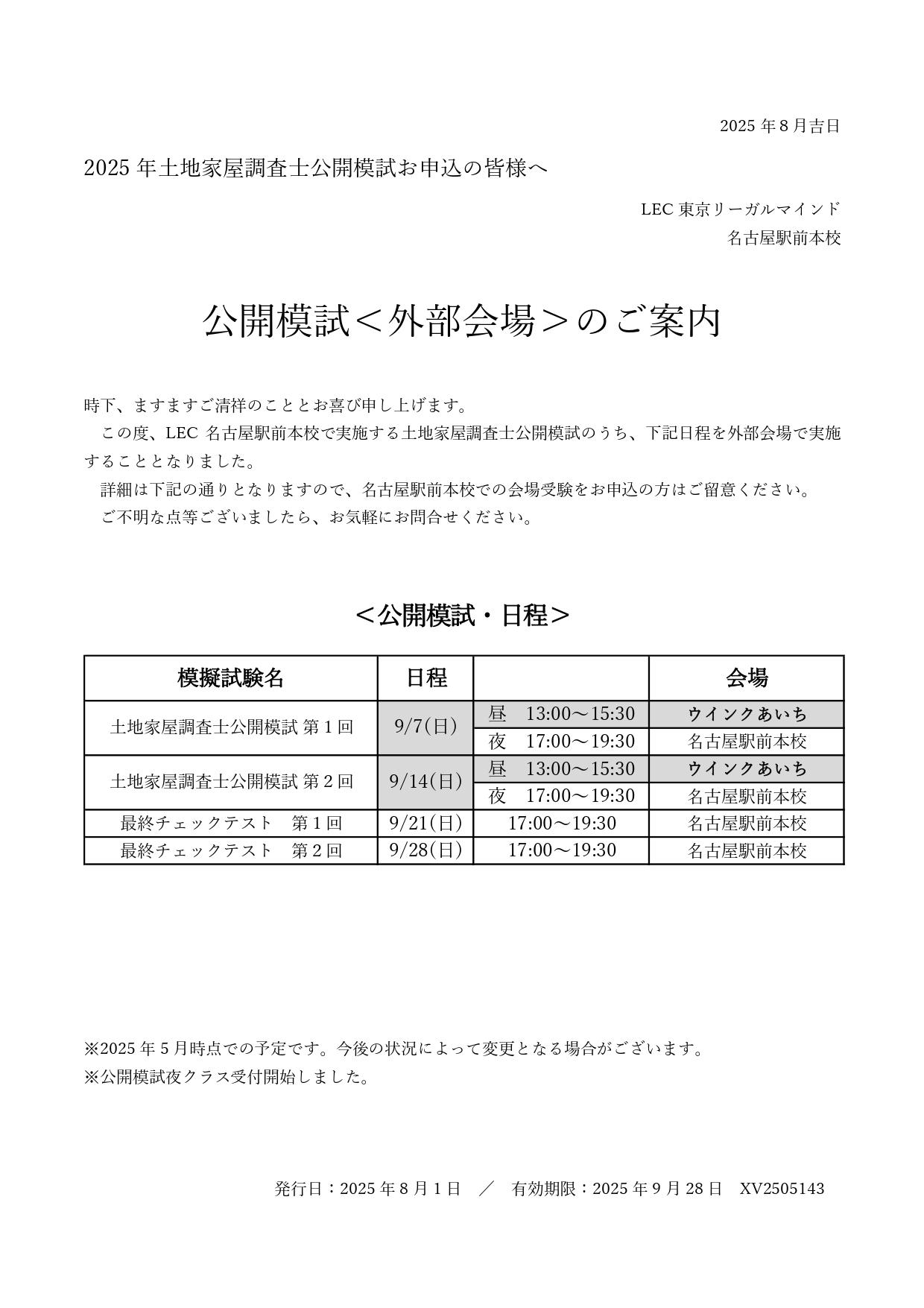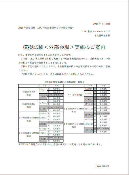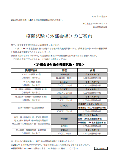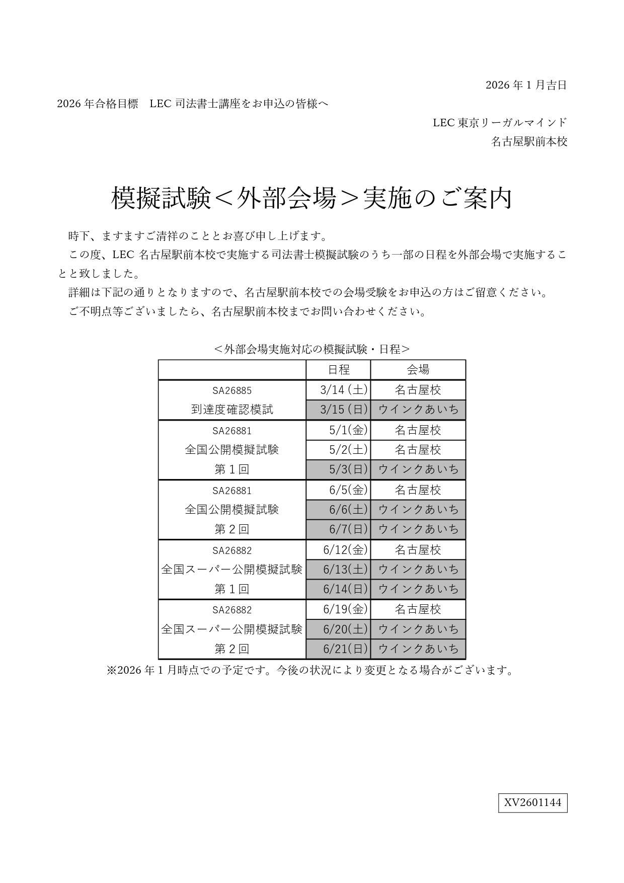 以下の模試・答練・講座は、外部会場にて実施いたします。なお、掲載情報は随時更新いたしますので、最新情報をご確認のうえ、ご出席くださいますようお願いいたします。
