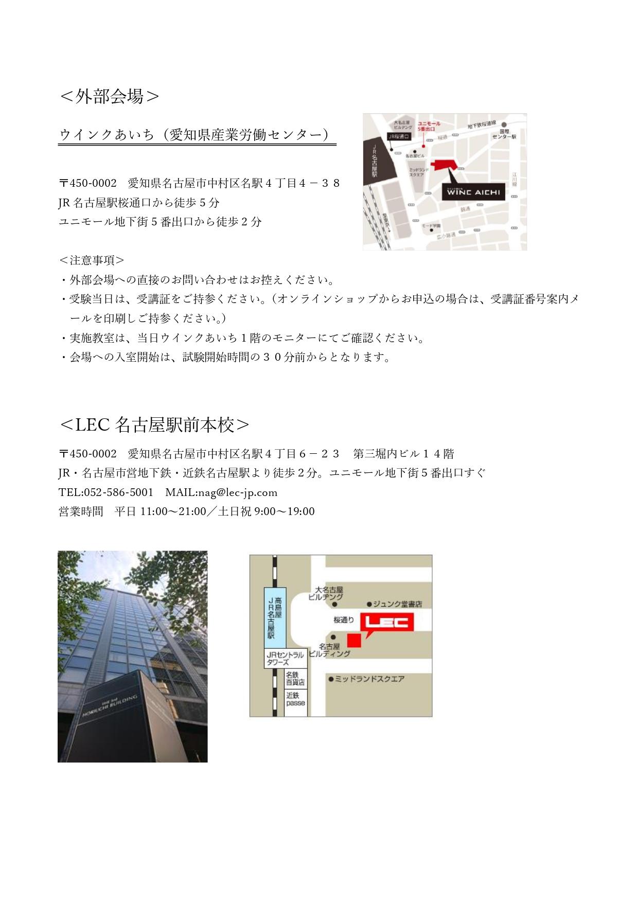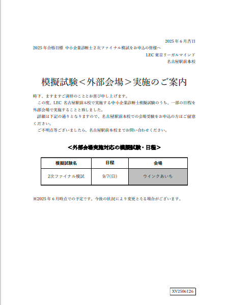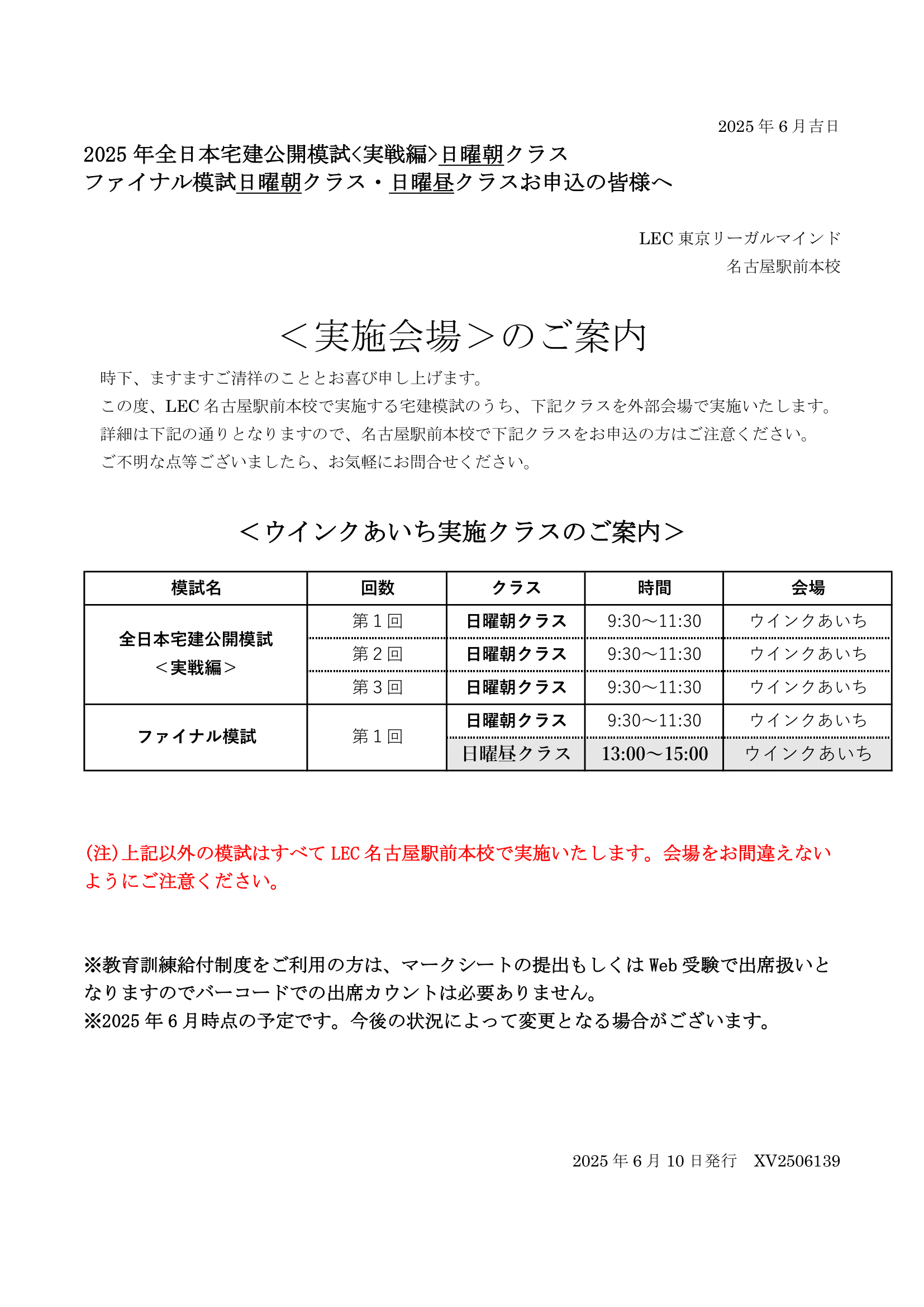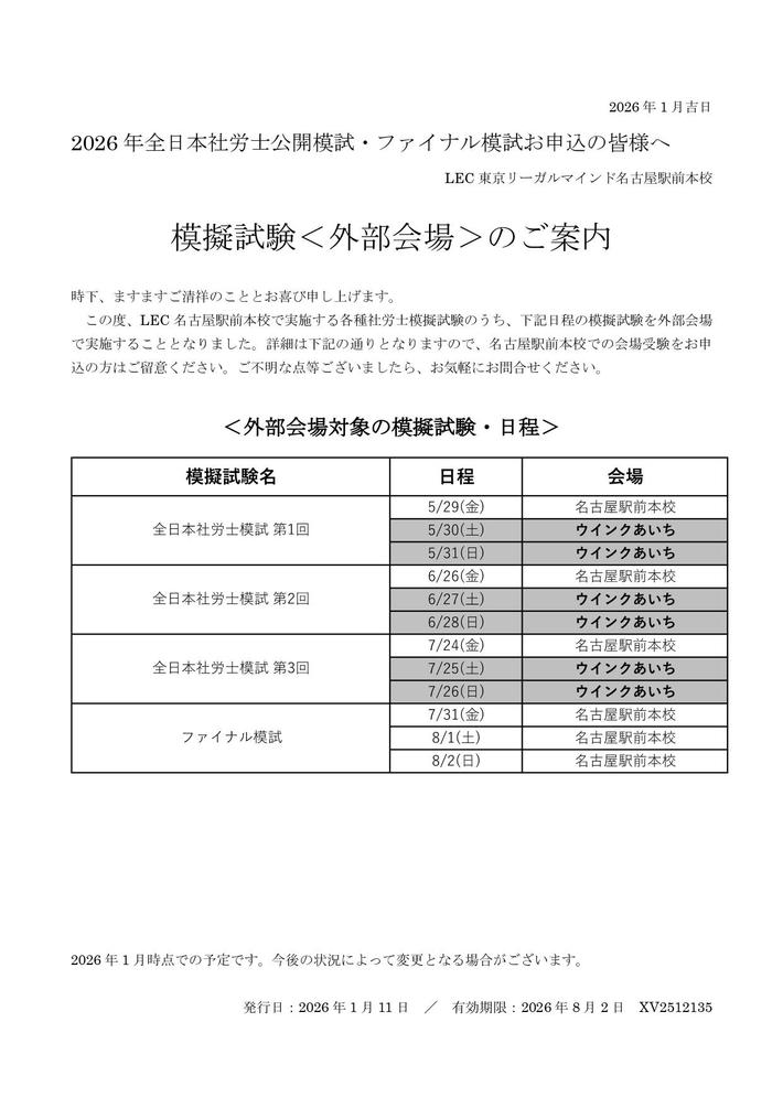 以下の模試・答練・講座は、外部会場にて実施いたします。なお、掲載情報は随時更新いたしますので、最新情報をご確認のうえ、ご出席くださいますようお願いいたします。