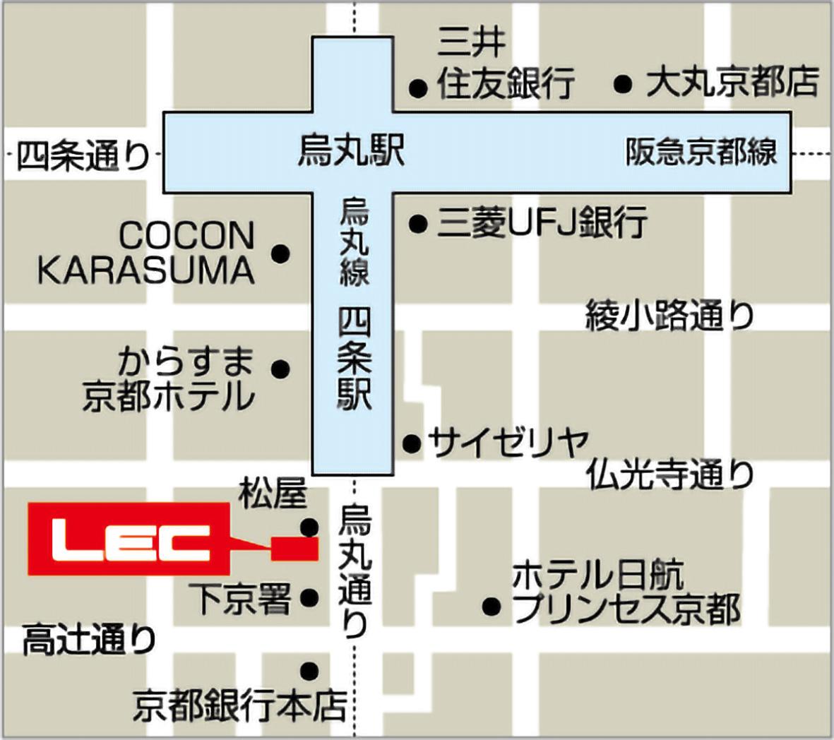 | 交通 | 阪急烏丸駅より徒歩5分。京都市営地下鉄四条駅(南改札)6番出口より徒歩1分。地上に出て南方向へお進みください。 |