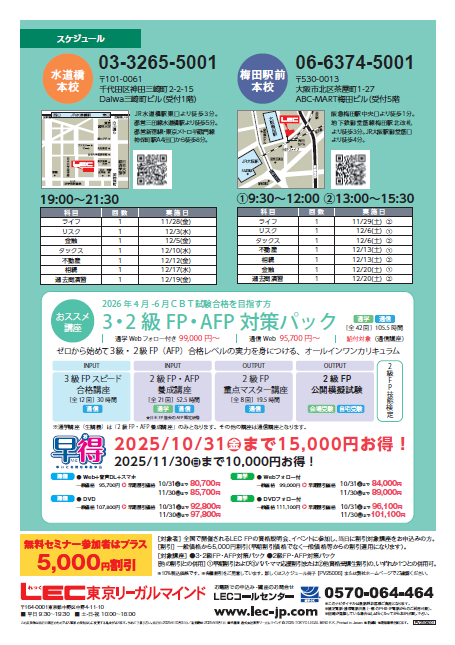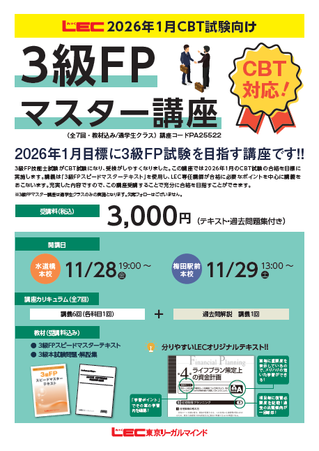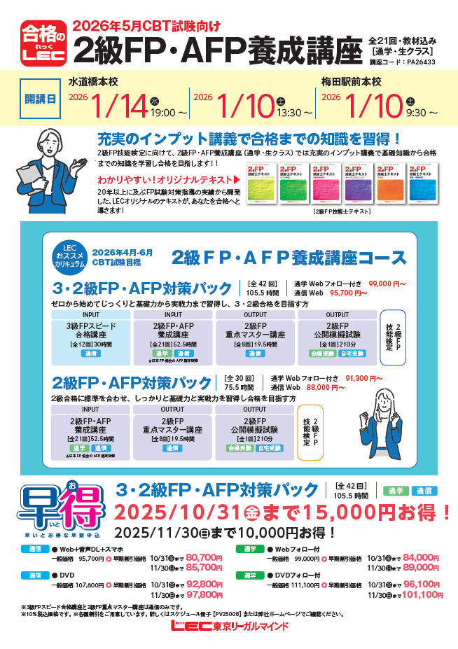 梅田駅前本校担当者 2025.10.27 【FP3・2級向け 講座説明会】 【3級FPマスター講座★3,000円★】 【2級FP・AFP養成講座】 【CFP 講座説明会】 FP ファイナンシャルプランナー カテゴリー一覧へ LECトップページへ 受講相談予約 資格説明会ガイダンス Zoomガイダンス予約 資料請求 見積り依頼 オリジナルブログ 人材募集 自習室のご案内 教室スケジュール Myページ 重要なお知らせ おすすめトピックス 新着情報 試験情報 開講案内 イベント情報 その他